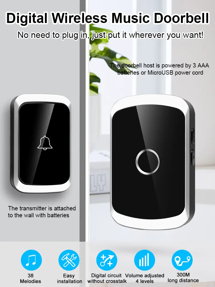 The transmitter is installed outside the door, and the receiver uses 3*AAA batteries(Not included)/Micro USB power cord (Not included)to power the power supply. Press the transmitter to ring the bell, and the receiver immediately rings the bell and flashes a light to remind.