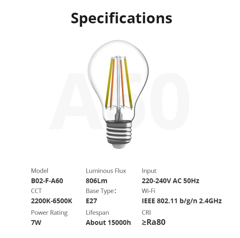 Specification of SONOFF B02-F Smart LED Filament Bulb: