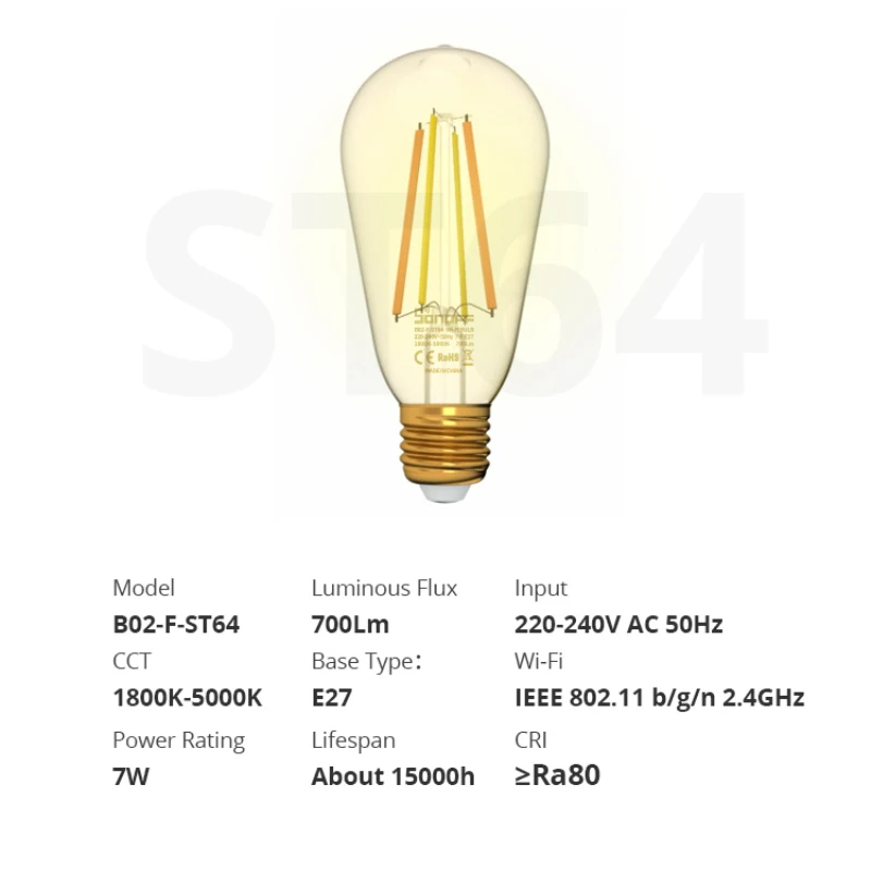What’s the difference between B02-F-A60 and B02-F-ST64? From the appearance, B02-F-ST64 is amber and B02-F-A60 is cyan. The amber offers 700 lumens with a color temperature from 1800K to 5000K, and the cyan emits a brightness of 800lm and color temperature of 2200K-6500K.
