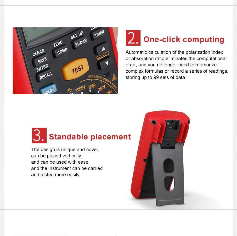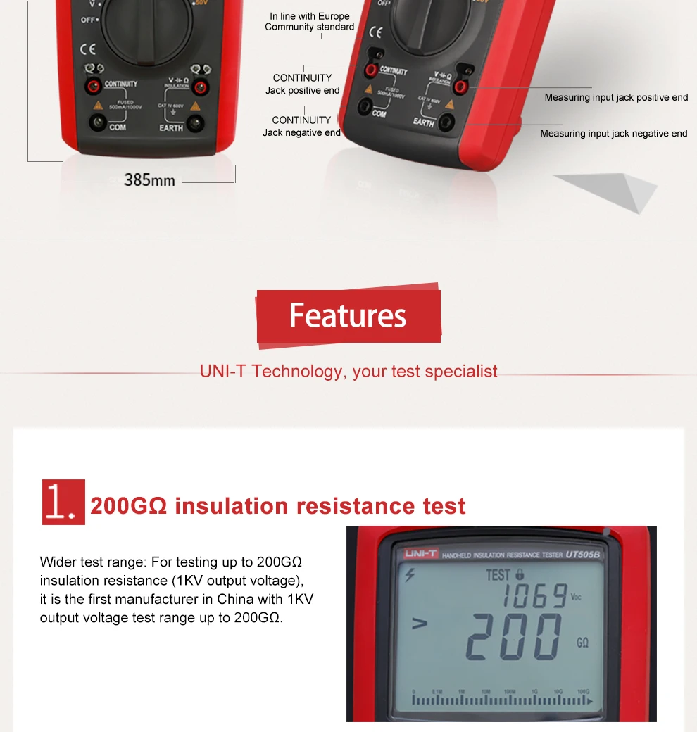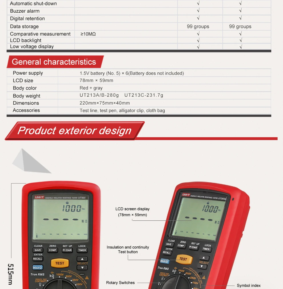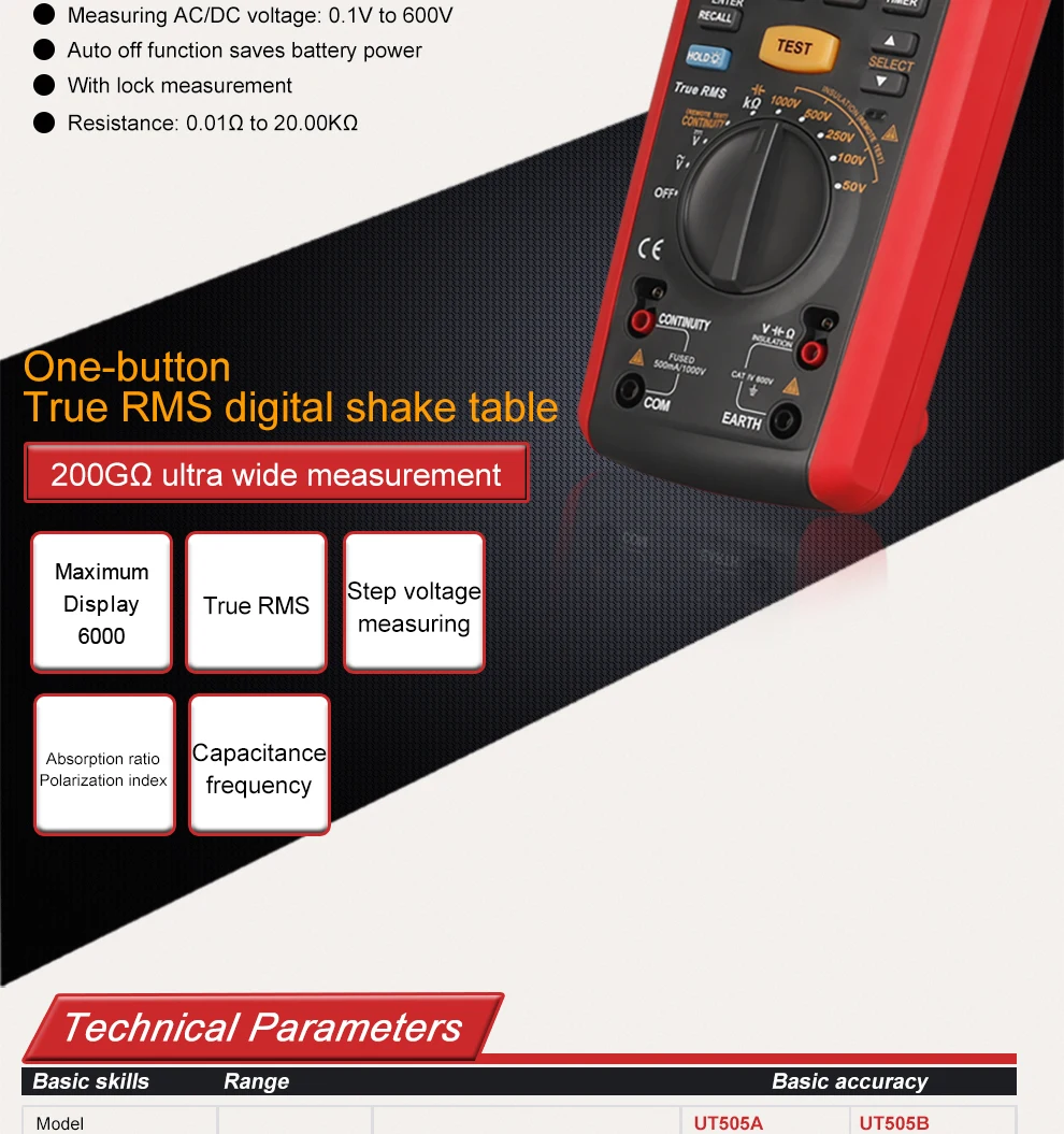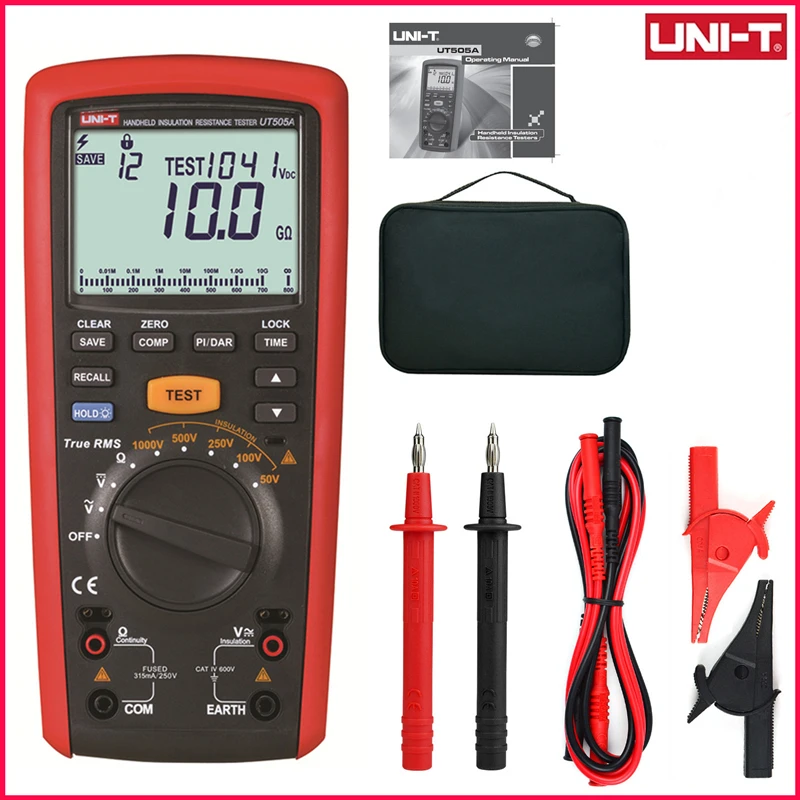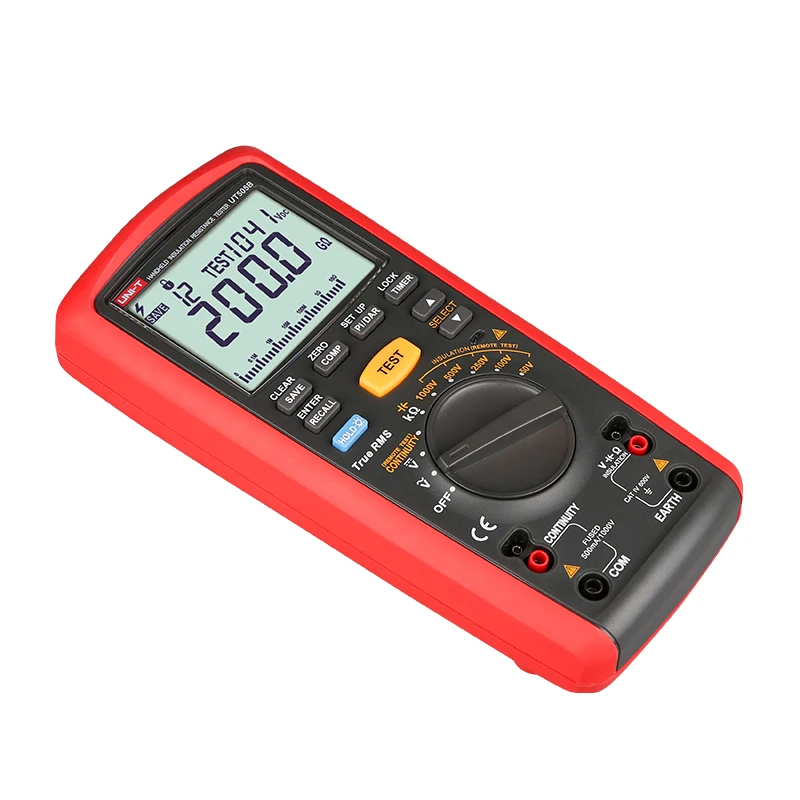 UT505 series handheld true RMS insulation resistance testers combine features of a digital multimeter and insulation resistance tester. Aside from the typical multimeter functions, these meters can also measure insulation resistance, PI, DAR, and automatically calculate resistance ratio to determine the insulation status.