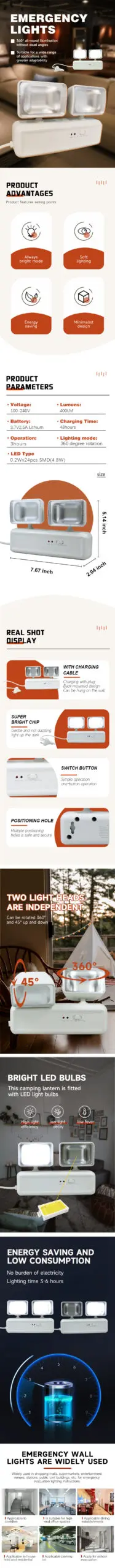 Wall-mounted Double-head Multifuctional Emergency Light Portable Camping Lantern Rechargeable Lamps for Power Outage Use