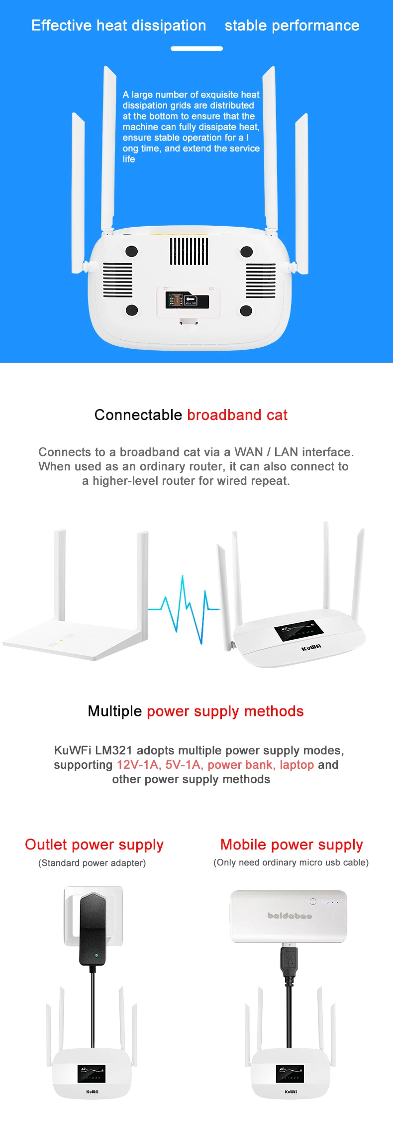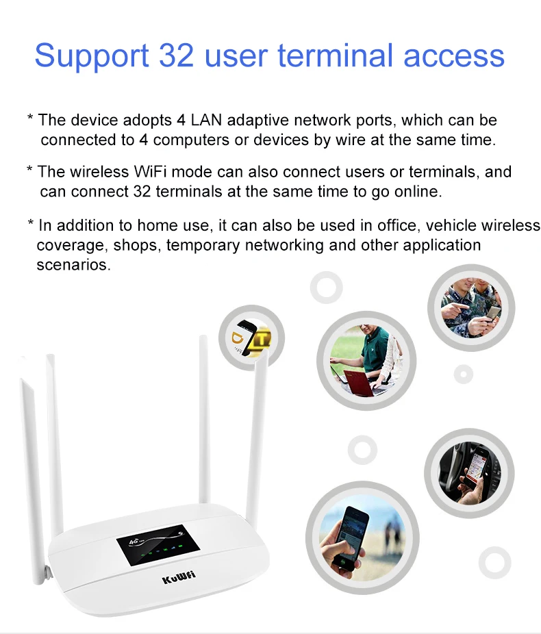 Provide high-speed for 32 users simultaneously, make you have a greater wireless enjoyme no need to connect the broardband ,there is 4G ,there is wifi,just plugs the 4G SIM card and play!some sim card should be update APN .Produce a 2.4GHz WFi hotspot with a powerful signal and long range WiFi coverage, good for camera project.